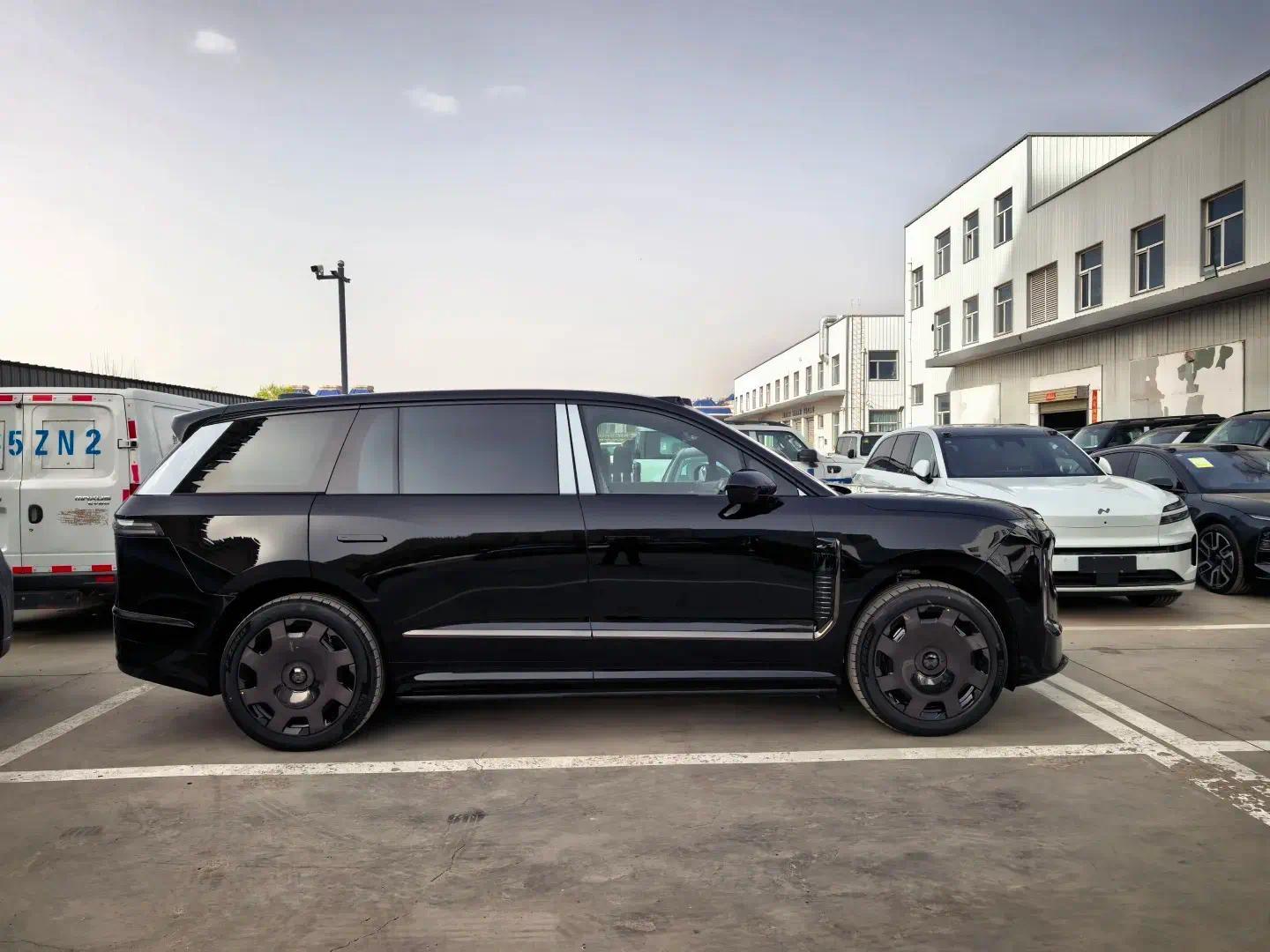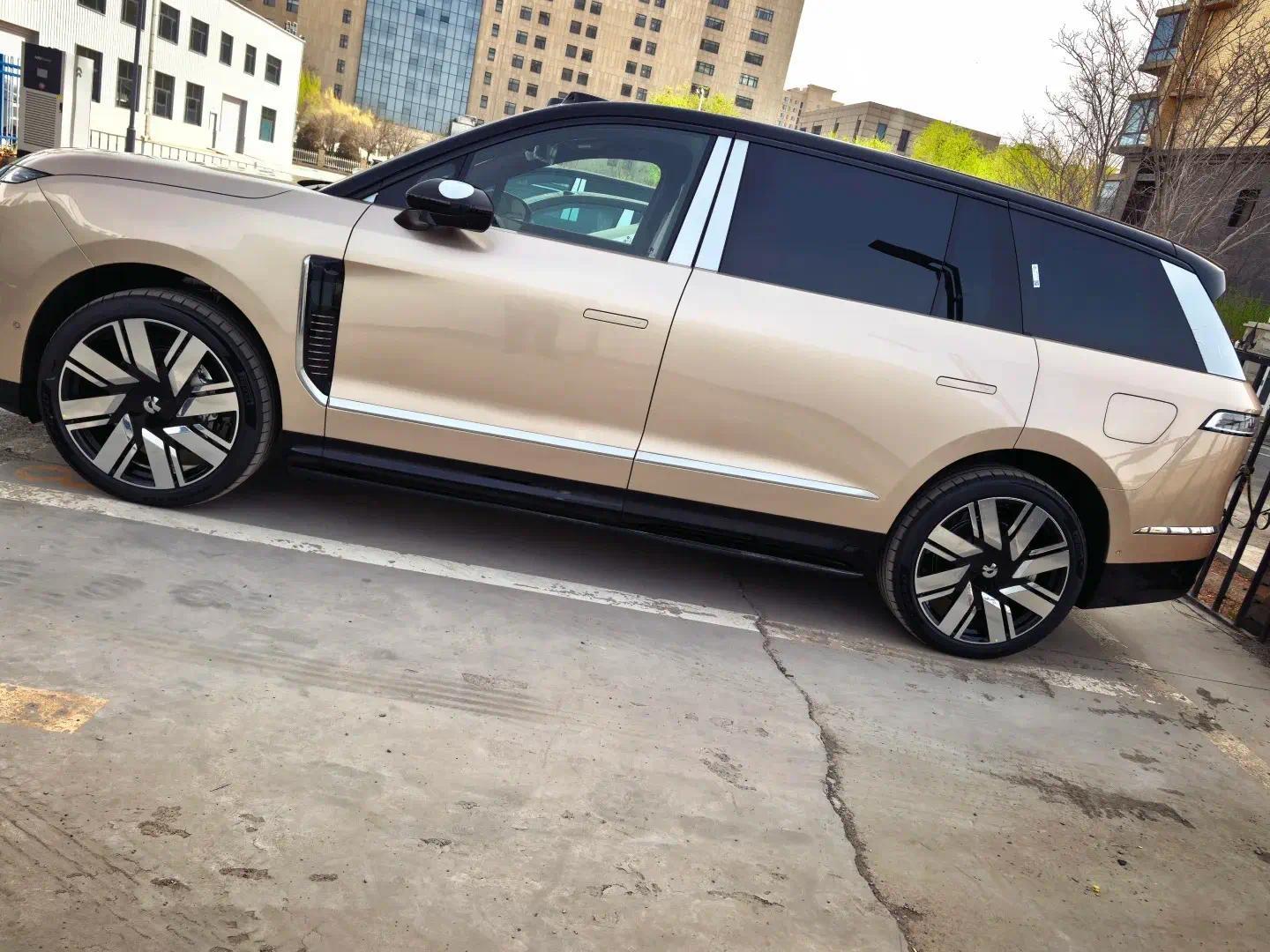 在车身的侧面,我们可以看到蔚来ES9采用的是和路虎揽胜类似的风格打造,新车采用的是下沉式的车顶,D柱采用前倾式的设计,造型非常的干练,和其它大型SUV的风格还是很有区别的。新车的侧面中间采用了突出的腰线,并且采用隐藏门把手,它的大饼轮毂看起来也十分特别。