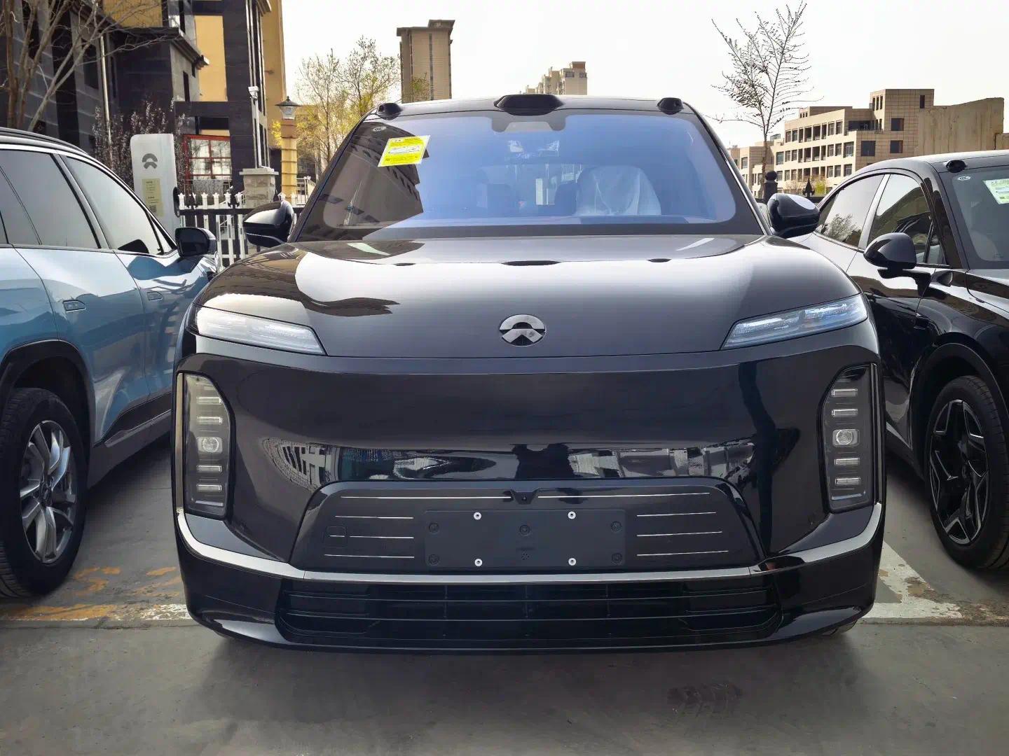 我们可以看到蔚来ES9采用的是非常厚重的设计语言打造,我们可以看到新车的前脸的部分采用的是非常立体化的风格打造,前脸的中间采用了一个大的凹槽设计,前脸的上方很突出。新车的大灯采用的是分体式的风格打造,日行灯很简单,它的主灯就表现得比较粗犷一些了,灯组采用的是很有层次感的设计,看起来非常的厚重。新车的前脸的底部还有一个梯形的格栅,整体采用了高亮黑色的装饰条点缀,中间还有贯穿式的镀铬条点缀,最底端还有高亮黑色的前铲。